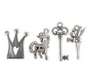 Piękny zestaw ozdobnych zawieszek VBS wykonany z metalu do tworzenia kreatywnych łańcuchów lub bransoletek. Składa się z czterech zawieszek w kolorze srebrnym. Różne bajkowe motywy można doskonale ze sobą łączyć.