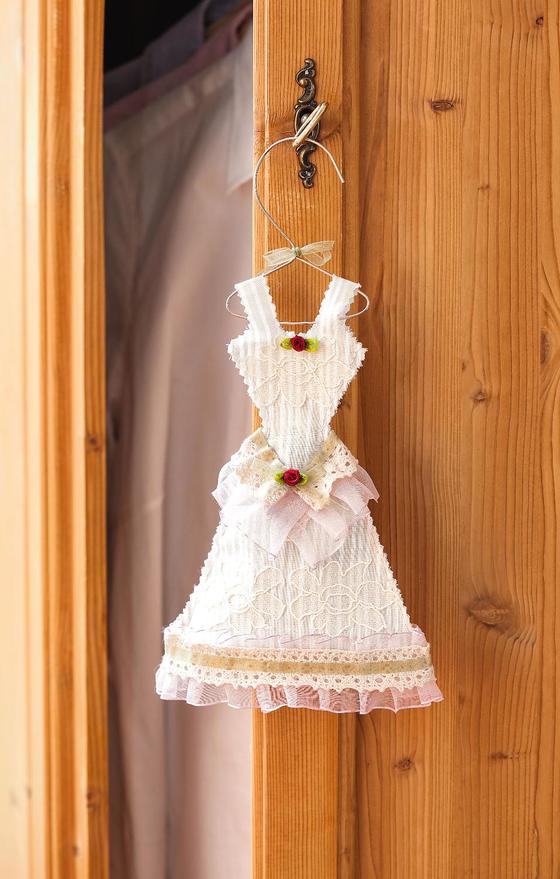 Wygnij wieszak z drutu aluminiowego za pomocą szablonu, zaginając ciasne zwoje na początku i na końcu za pomocą szczypiec okrągłych, a resztę ręcznie. Złącz końce drutu razem i połącz haczykiem. Zawieś gotową sukienkę na wieszaku.