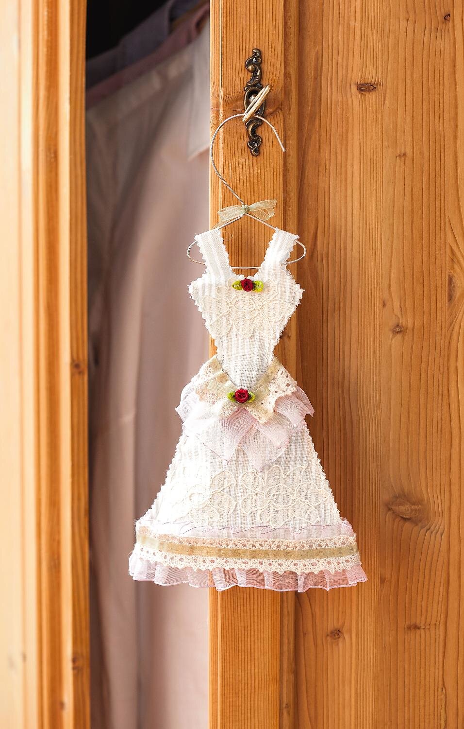 Umieść gotową saszetkę między przednią i tylną częścią i zszyj wszystkie cztery warstwy po bokach aż do pasków. Zbierz koronkową tasiemkę i szeroką różową tasiemkę z organzy, a następnie przyklej je jedna na drugiej wokół talii i wokół rąbka i zabezpiecz kilkoma szwami. Aby zakończyć, przyklej zieloną wstążkę z organzy na górze za pomocą taśmy, zawiąż małą kokardkę i przymocuj do dekoltu, rąbka i talii za pomocą satynowych różyczek.