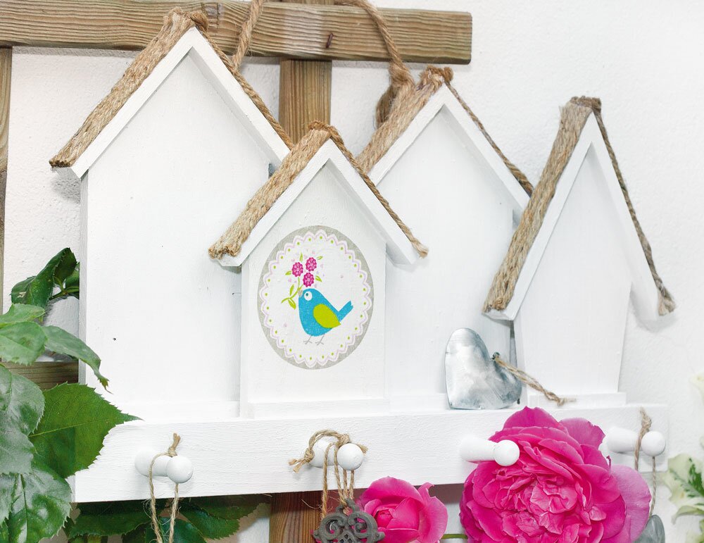 Udekoruj półkę ścienną na biało i pozostaw do wyschnięcia. Wytnij motyw z serwetki i przyklej go do półki za pomocą lakieru do serwetek. Przymocuj sznurek jutowy do dachów domków warstwami za pomocą gorącego kleju. Przymocuj sznurek jutowy do tablicy, aby ją zawiesić.