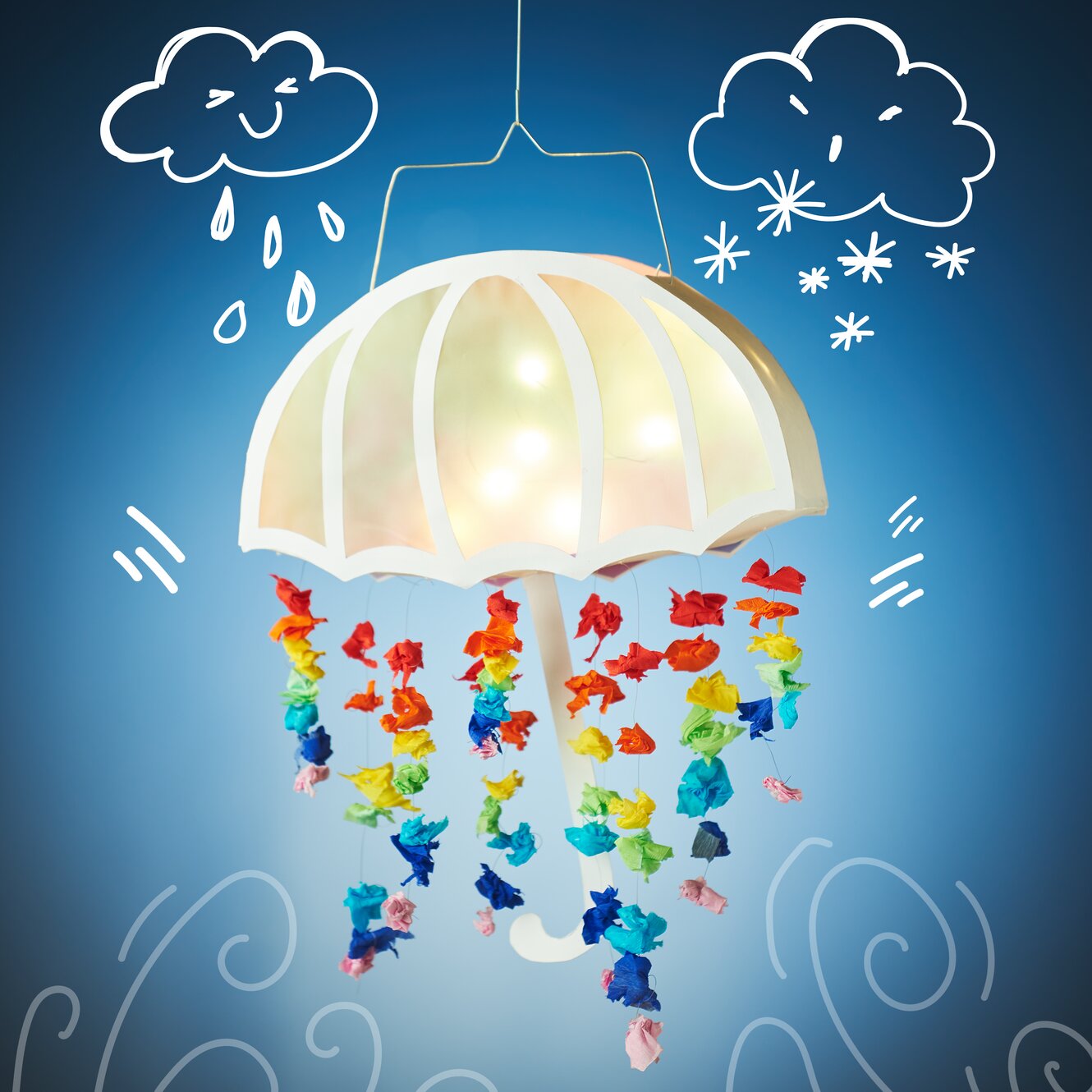 nylonowych nici. Za pomocą igły przeciągnij nici przez parasol od dołu i zawiąż je na supeł. Przeciągnij małe kulki z papieru krepowego na nici i zabezpiecz je dodatkowymi węzłami.