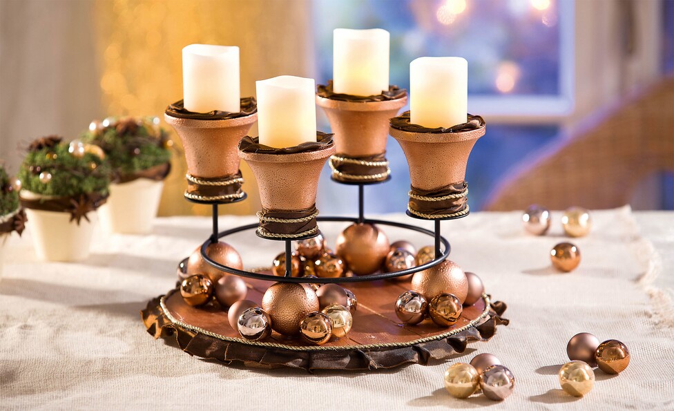 Owiń sznurek wokół świeczników, udekoruj podstawę szklanymi bombkami i włóż świece.