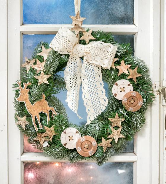 Przyklej korkowe gwiazdki i jelenia lub inne akcesoria dekoracyjne do wieńca za pomocą gorącego kleju według własnego gustu.