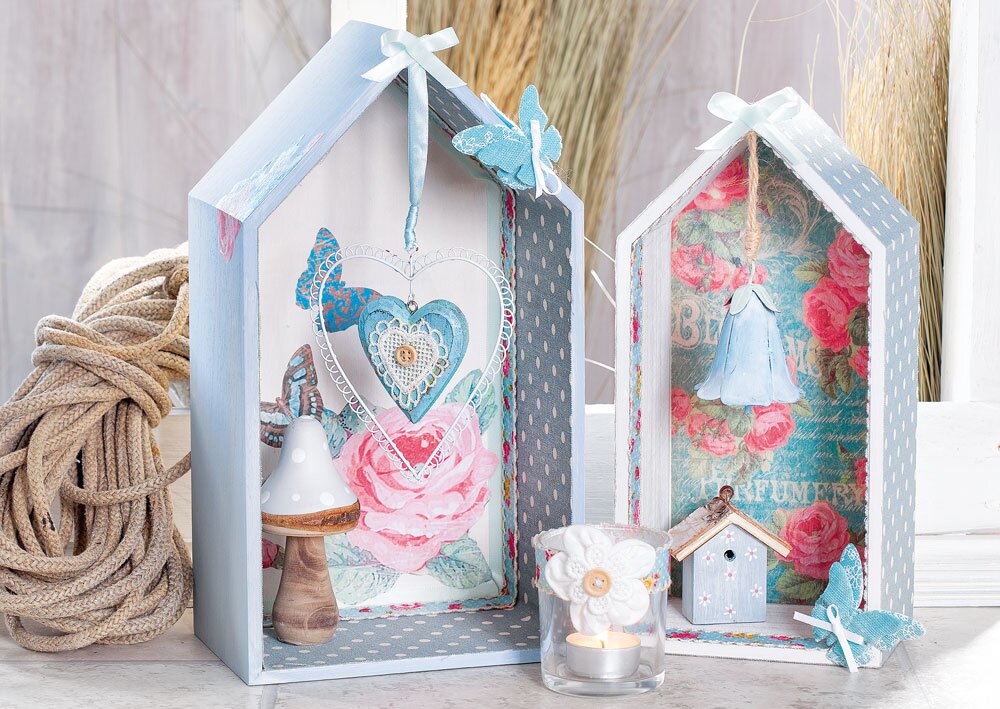 Pięknie pomalowane, sklejone i ozdobione pudełka "Living Home" to piękny pomysł na dekorację domu. Niezależnie od tego, czy stoją, czy są przymocowane do ściany - w pudełkach można prezentować dekoracyjne figurki lub wisiorki w wyjątkowo piękny sposób. Pudełka na półki domowe są wykonane ze sklejki i dlatego można je wspaniale pomalować lub przykleić. W naszych instrukcjach rzemieślniczych używamy farby vintage do powłoki bazowej i nici słomianych z różnymi motywami do naklejek. Najlepiej zrobić je teraz!