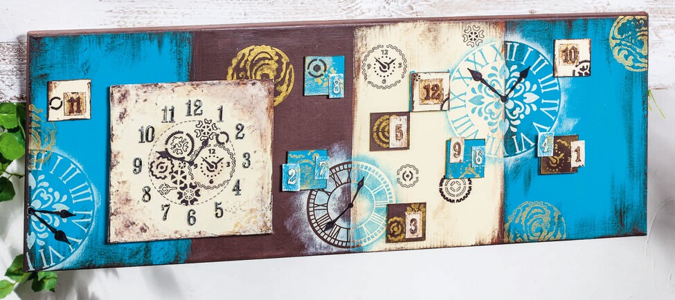 Najpierw rama blejtramu jest dzielona na cztery równej wielkości sekcje i malowana kolorami zawartymi w zestawie farb, jak pokazano na ilustracji. Antyczny wygląd obrazu uzyskuje się poprzez przetarcie farby Umbra wokół krawędzi i obramowań gąbką malarską po wyschnięciu kolorowego podkładu (technika przecierania). Następnym krokiem jest naniesienie złotego koloru za pomocą stempla Bel Arto NOVA. Najlepiej nadaje się do tego farba do szablonów, ponieważ ma kremową, ale niezbyt płynną konsystencję. Zegary i mechanizmy są następnie nanoszone za pomocą szablonu malarskiego w pasujących kolorach. Zaprojektuj również i przetrzyj deski do malowania określonymi kolorami.