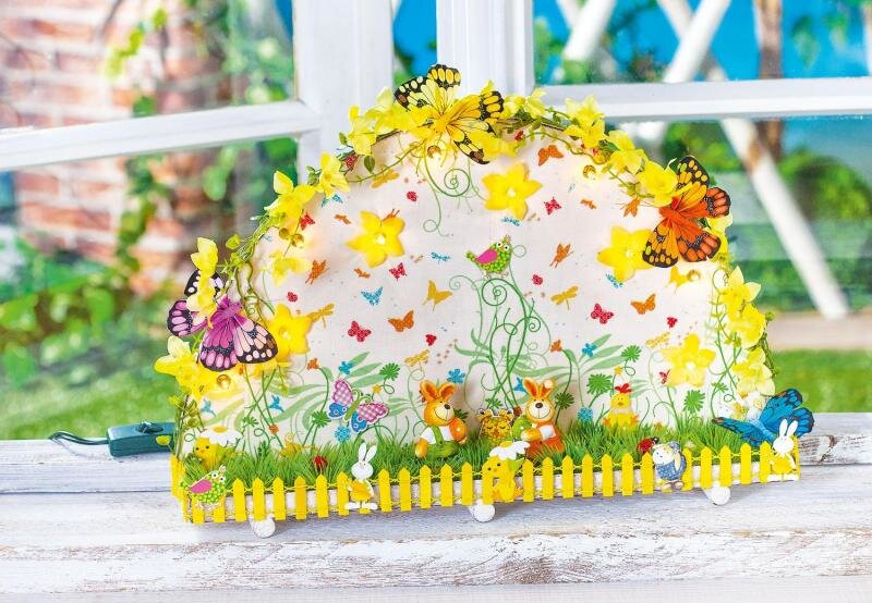 Teraz uszczelnij serwetkę lakierem do serwetek VBS, nakładając lakier na motyw od wewnątrz na zewnątrz. Użyj do tego pędzla do serwetek VBS, który umożliwia równomierną aplikację i minimalizuje ryzyko zmarszczek lub rozdarć motywu. Po wyschnięciu odetnij nadmiar papieru skalpelem. Przytnij matę z trawy, aby pasowała do płyty podstawy i przymocuj ją, podobnie jak ogrodzenie, za pomocą gorącego kleju. Teraz możesz udekorować łuk świetlny rozsypanymi kawałkami, motylami, parą królików i girlandą żonkili, a następnie włożyć lampki choinkowe do wstępnie wywierconych otworów od tyłu. W razie potrzeby można je przymocować za pomocą gorącego kleju. Na koniec przeciągnij kilka kwiatów żonkili z girlandy nad światełkami.