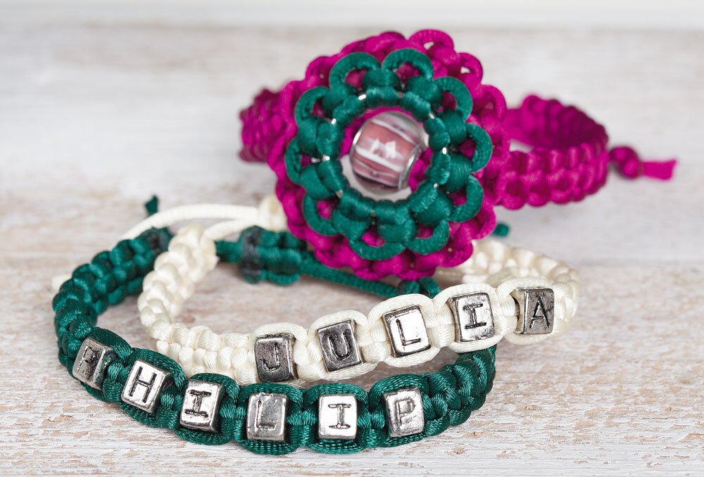 Bransoletki wykonane techniką makramy są szybkie i łatwe do zrobienia. Wszystko, czego potrzebujesz, to odrobina umiejętności i wytrwałości podczas wiązania węzłów. Małe koraliki dodają spersonalizowanego wyglądu. Ozdobiona koralikami z literami, bransoletka makramowa może być świetnym prezentem na znak przyjaźni.