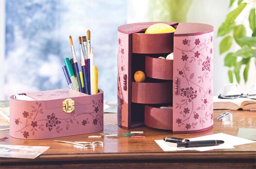 Zagruntuj zewnętrzne powierzchnie szafki i skrzynki na przybory mieszanką kolorystyczną farby szablonowej w kolorze białym z oberżyną i odrobiną kawowego brązu. W przypadku ciemniejszych obszarów (wewnątrz, a także na górze i na dole szafki) użyj farby do szablonów w kolorze oberżyny. Poczekaj, aż kolory dokładnie wyschną. Spryskaj szablon klejem w sprayu "Non-Permanent 404" i umieść go na wybranej powierzchni (patrz również wskazówka).
