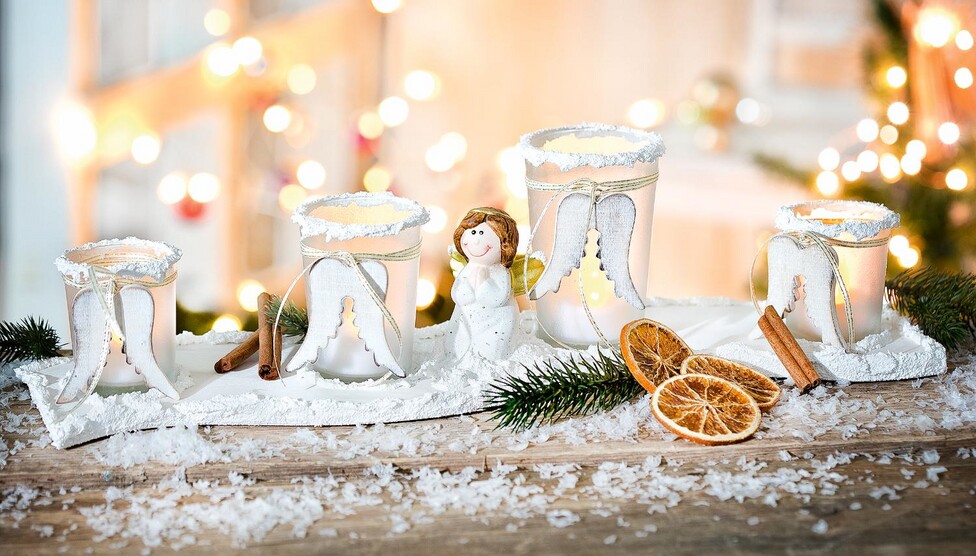 Gdy wszystko wyschnie, nadszedł czas na dekorowanie: Wystarczy umieścić słoiczki na podgrzewacze w przewidzianych do tego wgłębieniach i przymocować wstążkę ze skrzydłem anioła do każdego słoiczka. Następnie wystarczy ułożyć aniołki i świąteczne akcesoria na podstawce na podgrzewacze.