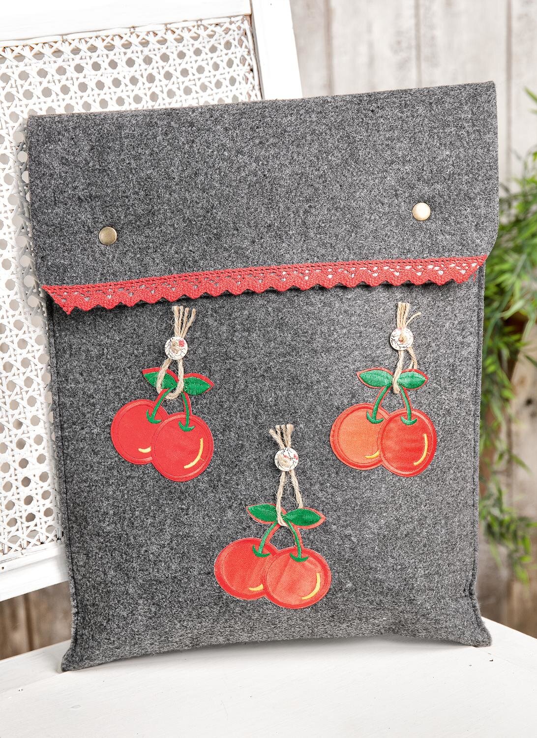 Następnie wyprasuj wiśniowe aplikacje na filcowej torbie i przyklej sznurek wraz z guzikami.