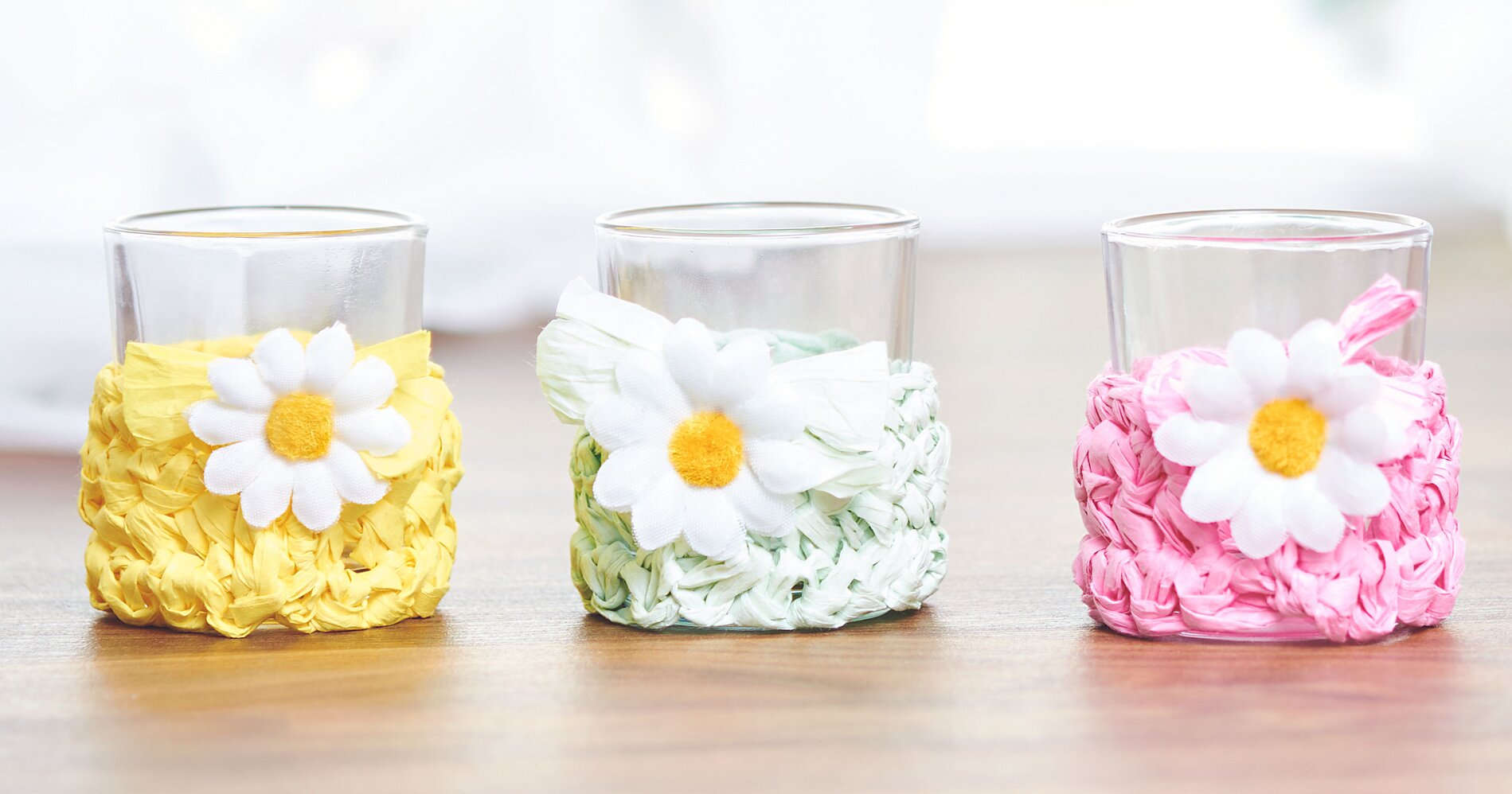 Na koniec udekoruj każdy podgrzewacz kwiatem stokrotki .