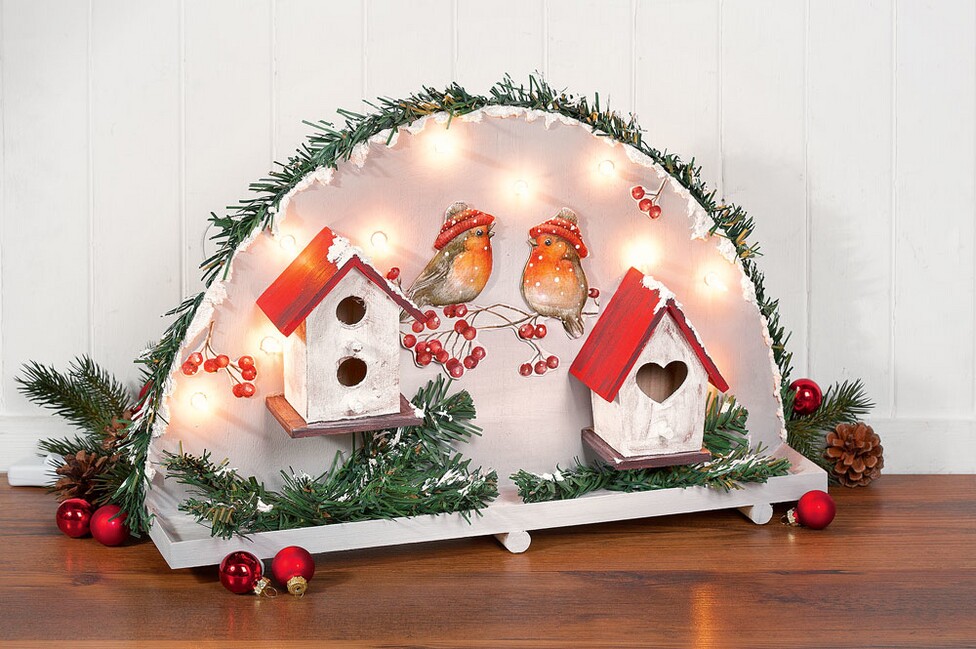Stwórz przytulną atmosferę! Ten łuk świetlny z dwoma małymi budkami dla ptaków jest nie tylko piękną zimową dekoracją, ale także wyczarowuje wyjątkową atmosferę w Twoim domu dzięki swojemu oświetleniu.