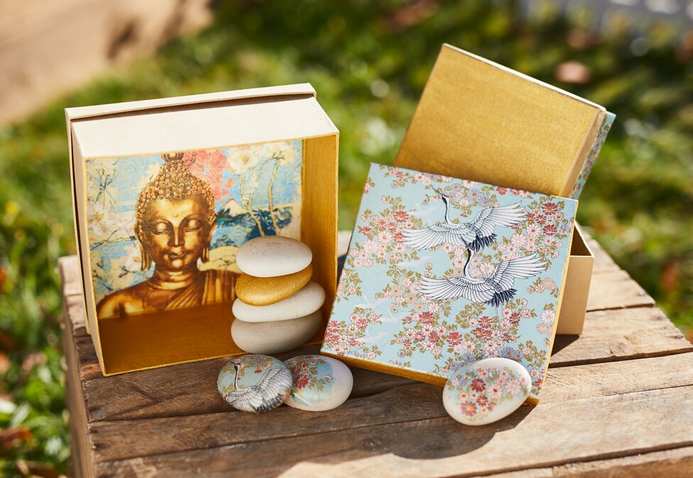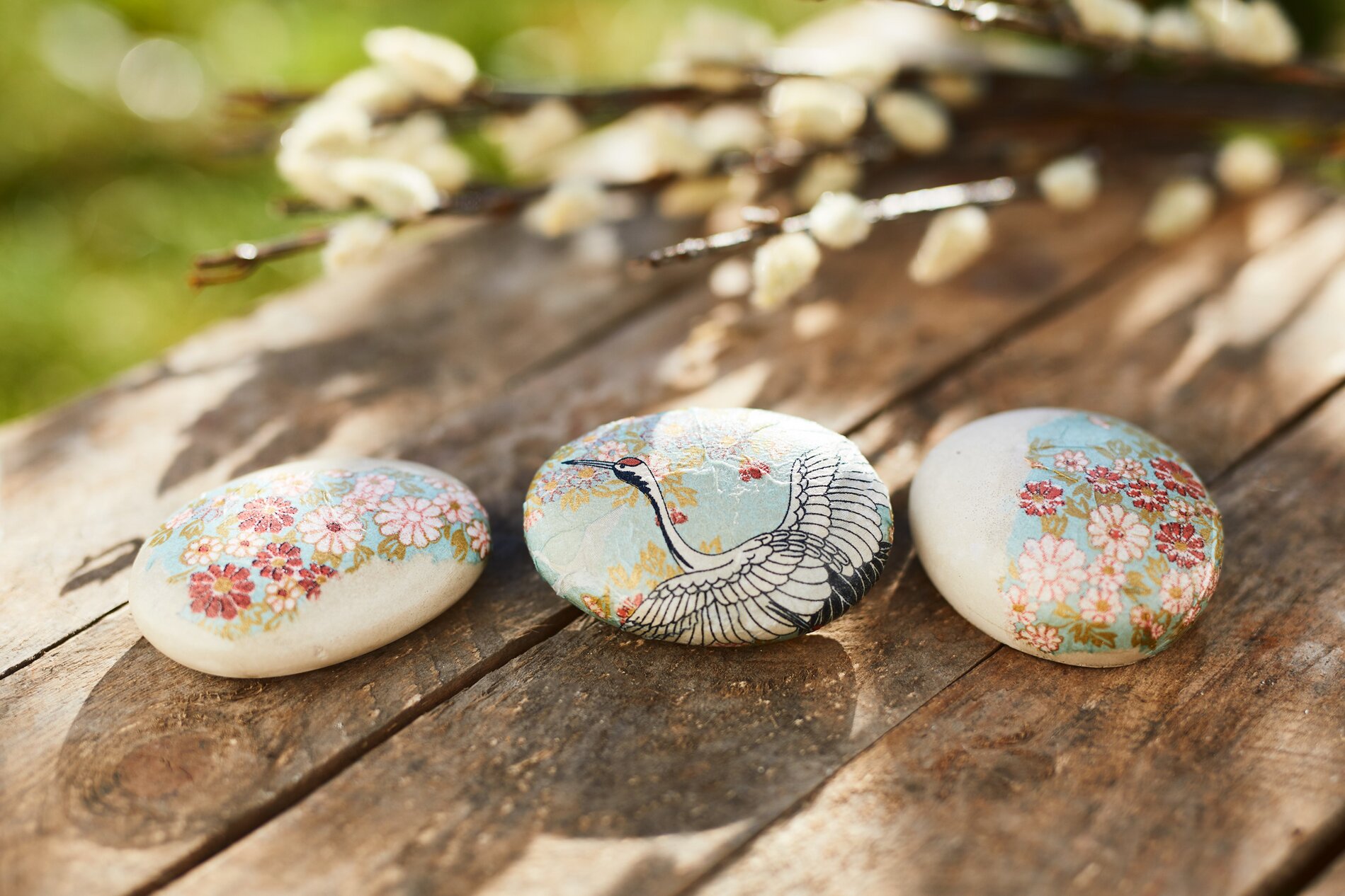 Pokryj pozostałe odlane kamienie farbą do serwetek VBS i przyklej do nich górną zadrukowaną warstwę serwetki.