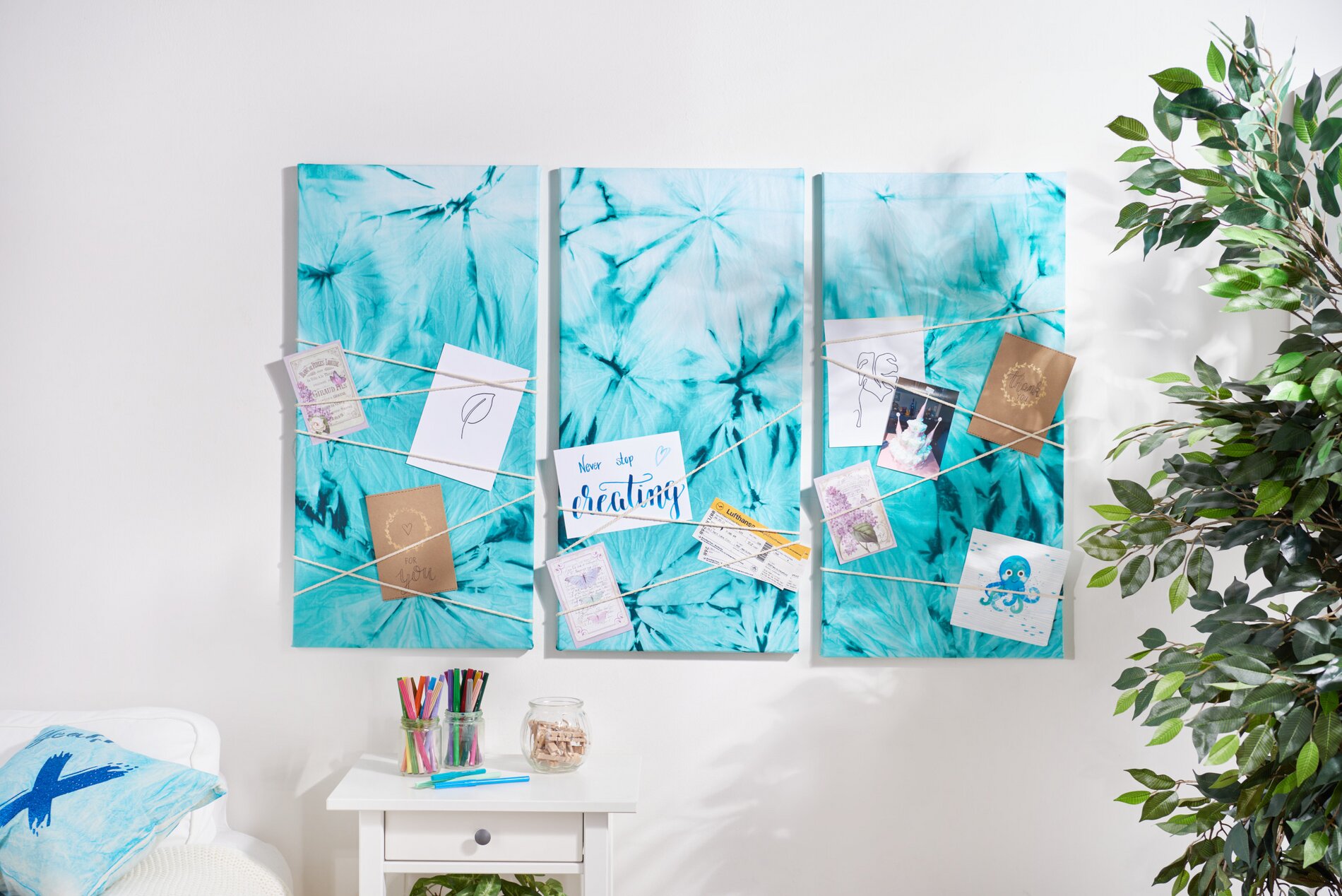 Tablica memo jest tryptykiem, tzn. składa się z trzech części. Dlatego należy podzielić tkaninę na trzy równe części, tak aby każdą z nich można było naciągnąć na blejtram o wymiarach 40 x 80 cm i przymocować z tyłu.