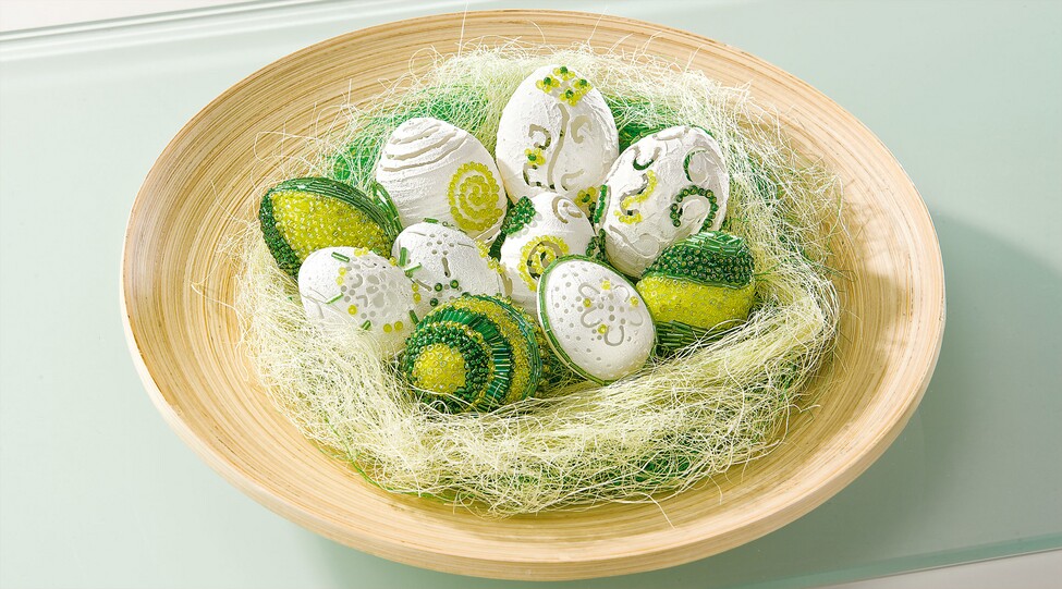 Po wyschnięciu narysuj wzór na przygotowanych jajkach według własnego gustu za pomocą pisaka liniowego. Przytrzymaj jajko ręcznie i wytnij wzór za pomocą cienkiego wiertła: Najpierw wywierć otwór w jajku, poprowadź wiertło nad wcześniej narysowanym wzorem, tak jak w przypadku grawerowania. Krawędzie są następnie usuwane za pomocą nasadek szlifierskich.