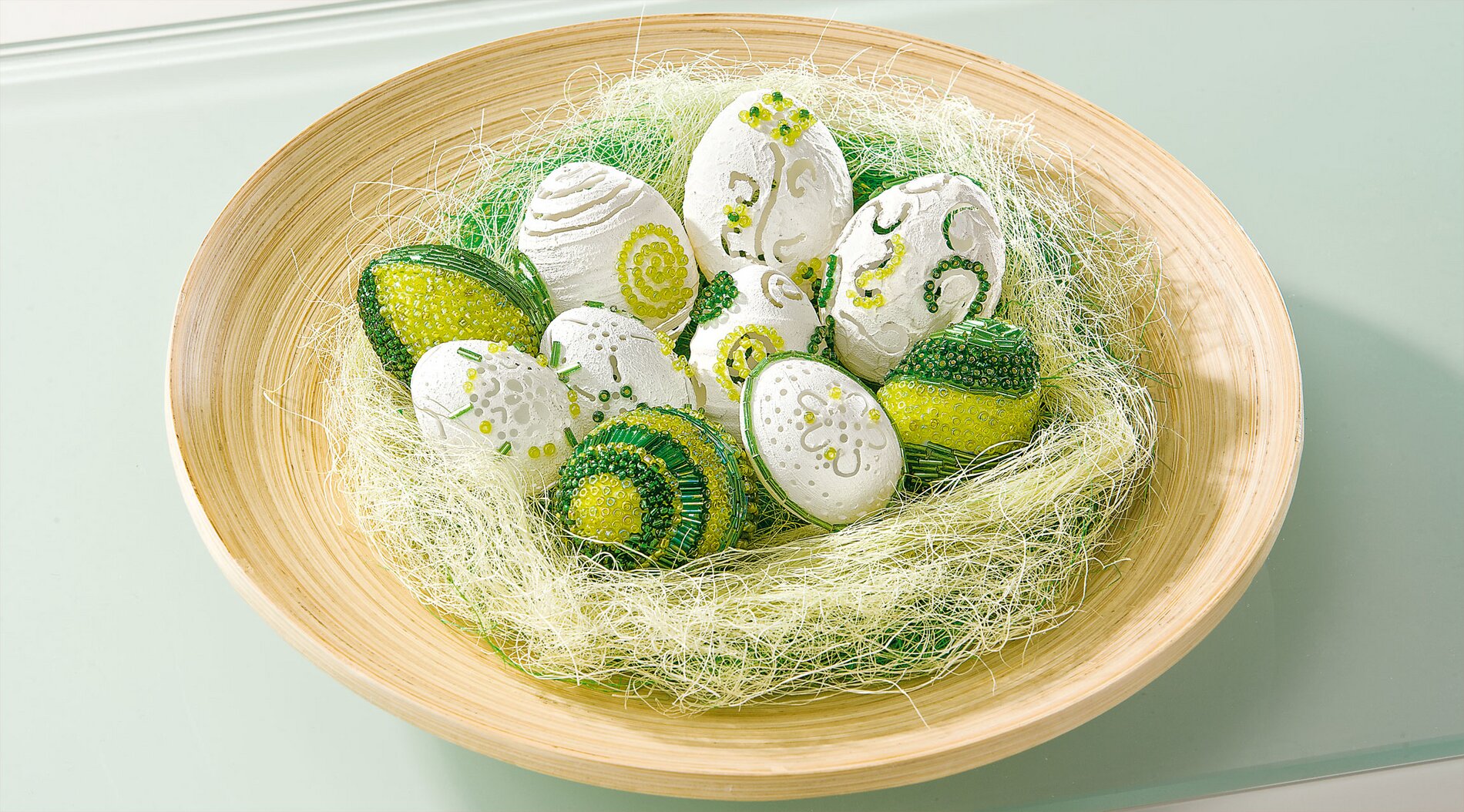 jajek, które należy zagruntować jasną pastą drukarską, aby wygrawerować na nich filigranowe wzory. Aby to ułatwić i utrzymać ręce w czystości, plastikowe jajka są najpierw mocowane do drewnianych patyczków za pomocą gorącego kleju. Aby wyschły, wystarczy włożyć białe jajka do cegły.