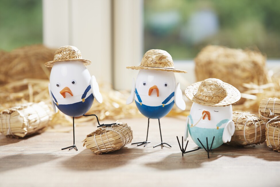 nożyczkami. Przymocuj dzioby, skrzydła, oczy i słomkowe kapelusze za pomocą