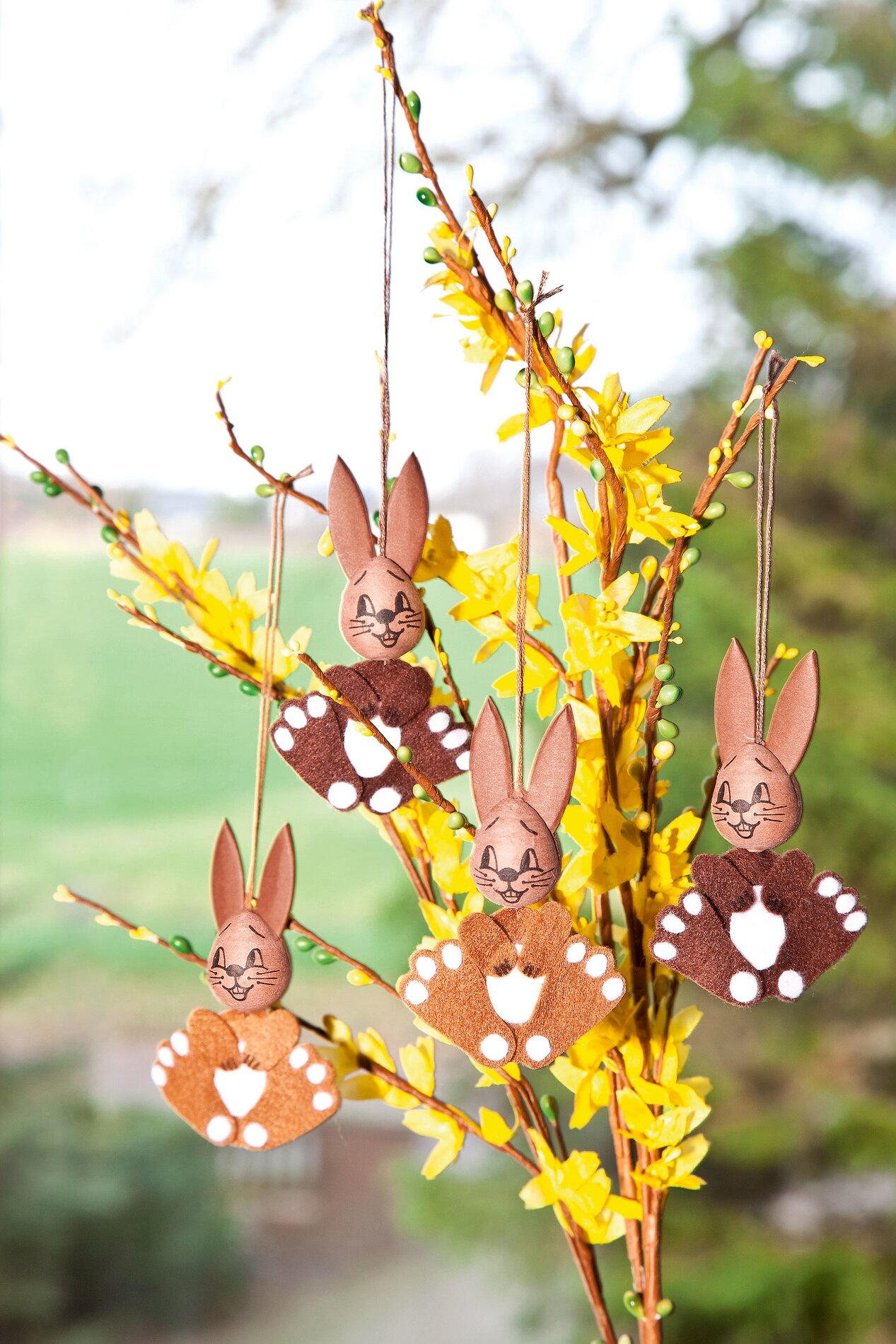 Użyj igły, aby przewlec nitkę hafciarską przez filc korpusu. Owiń małą "szyję" i przyklej ją do otworu w głowie króliczka. Przyklej wiszącą wstążkę do głowy.