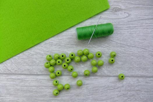 Näht an der Innenseite der Schote einen Faden an und knotet ihn gut fest. Auf diesen Faden fädelt ihr nun 5 Perlen als Erbsen auf und vernäht den Faden anschließend auch am anderen Ende der Schote gut.