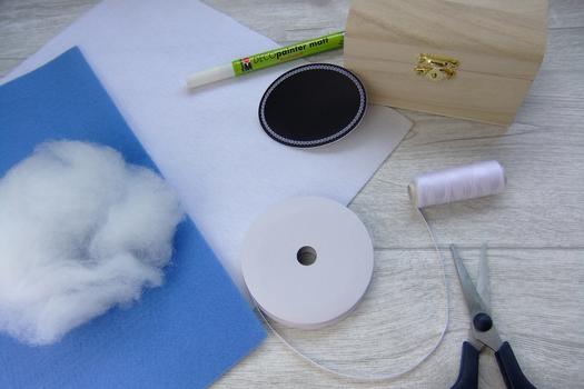 Zunächst schneidet aus dem weißen Filz Rechtecke von 10 x 4 cm aus (je nachdem wie viele Teebeutel ihr basteln wollt – pro Teebeutel braucht ihr ein Rechteck) und in entsprechender Anzahl aus dem hellblauen Filz Rechtecke von 4 x 2 cm.