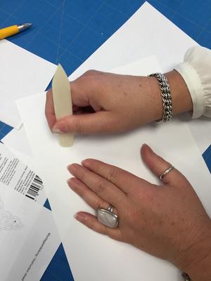 Nun legt Ihr das Transfer Papier mit dem Motiv nach unten auf die gewünschte Fläche. Um das Motiv zu übertragen, verwendet ihr am besten ein Falzbein und fahrt damit fest über die Oberfläche vom Papier. Hierbei müsst ihr aufpassen, dass das Papier nicht verrutscht und ihr wirklich jede Stelle erwischt.Wenn ihr euch sicher seid, dass keine Stelle ausgelassen wurde, könnt ihr das Papier ganz einfach abheben – und schon seid ihr fertig!