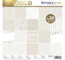 Podkładka do scrapbookingu z 40 arkuszami o metalicznym wyglądzie w kolorze złotym i różnych wzorach. Każdy motyw jest dostępny w dwóch egzemplarzach. Gramatura tego wzornika wynosi 100 g/m² w formacie 30,5 x 30,5 cm. Papier jest bezkwasowy i zadrukowany jednostronnie tuszem roślinnym.