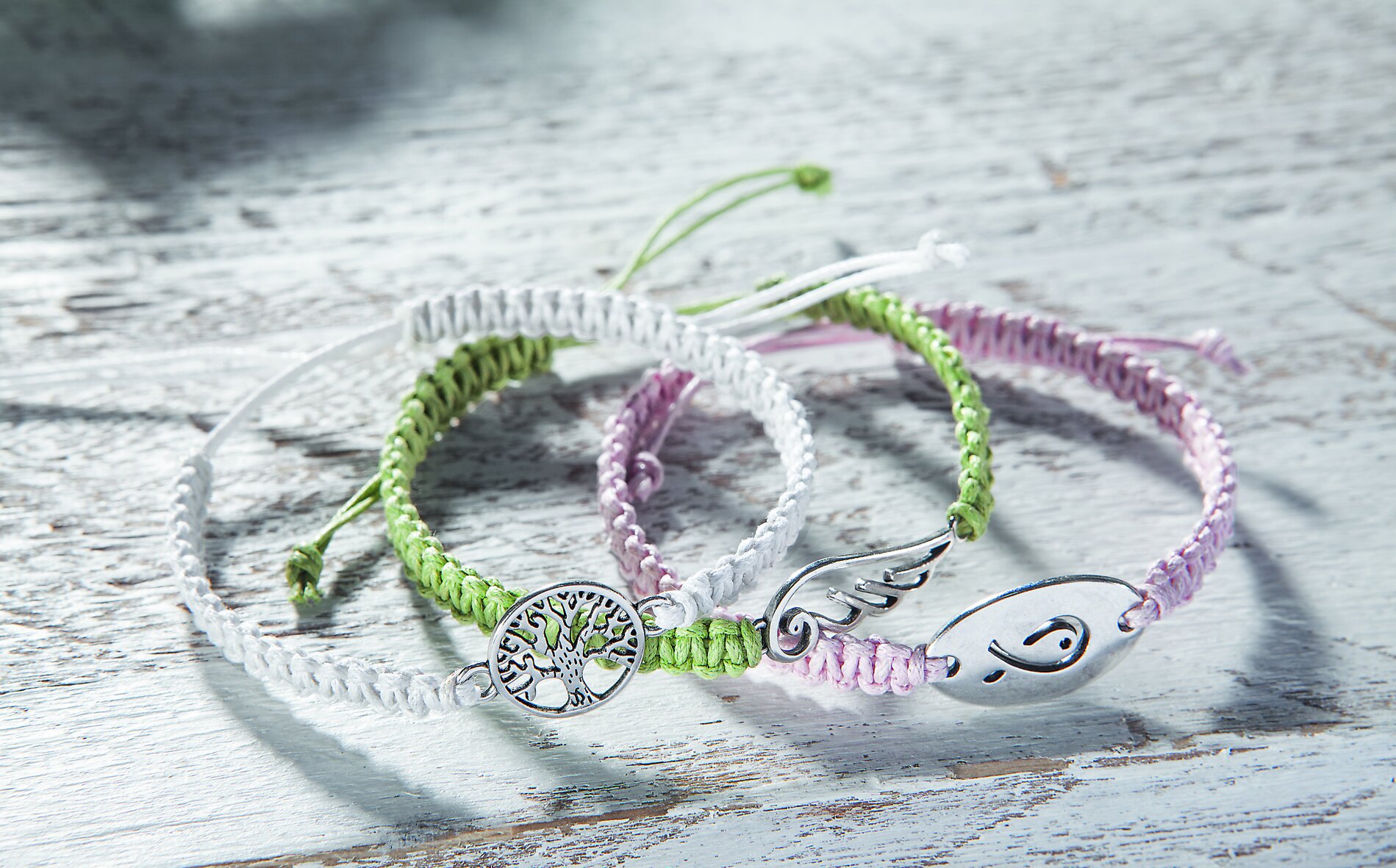 Aby to zrobić, umieść prawą zewnętrzną nitkę nad dwiema środkowymi nitkami, lewą zewnętrzną nitkę za środkowymi nitkami i przeciągnij każdą z nich przez utworzoną pętlę. W następnym kroku przełóż lewą zewnętrzną nitkę nad środkowymi nitkami, a prawą zewnętrzną nitkę pod środkowymi nitkami (zawsze naprzemiennie). W ten sposób powstanie płaski węzeł. Zawiąż ciasny węzeł na końcu.
