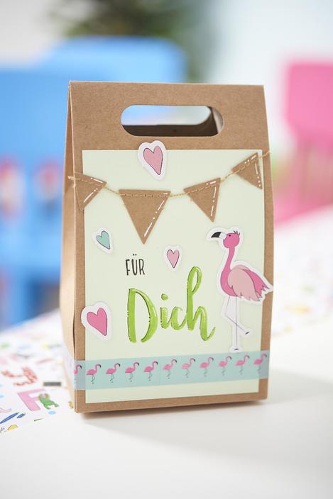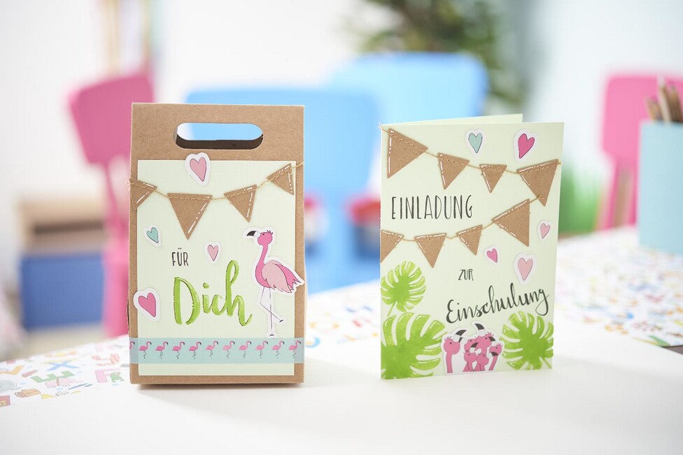 zestawu kartek, takie jak flamingi i serca.