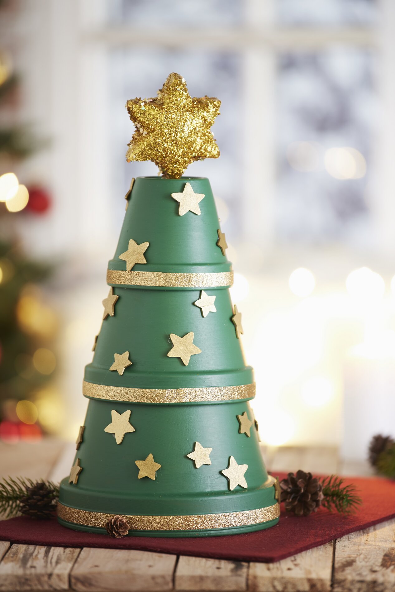 Używając kleju montażowego, najpierw sklej doniczki z terakoty, aby utworzyć piramidę, a następnie udekoruj wszystko złotą posypką gwiazdkową (również przyklejoną).