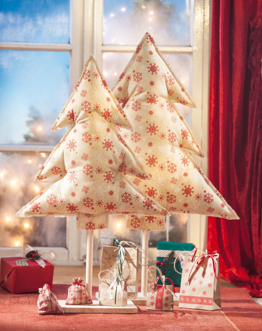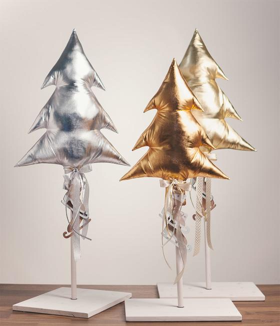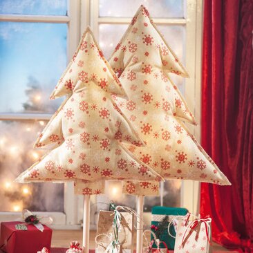 Po wyschnięciu farby włóż patyczek do wypchanej choinki, a następnie do podstawy. Czy choinka jest dobrze wypchana? Uformuj ją w odpowiedni kształt i zaszyj otwór, aby wszystko stabilnie stało na własnoręcznie wykonanym stojaku.