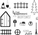 Czarujące przezroczyste stemple "Wichtelwelt" wykonane z silikonu. Zestaw stempli zawiera 13 stempli z motywami o wymiarach od ok. 0,7 x 1,0 cm do 2,7 x 4,1 cm.