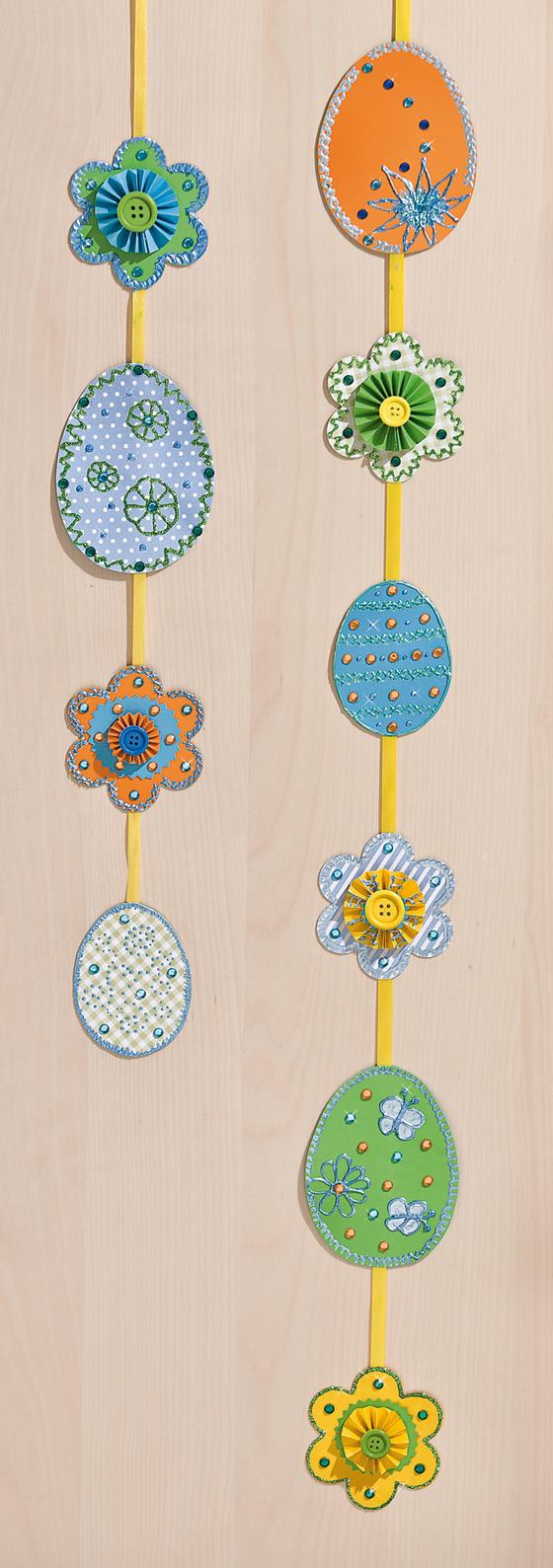 Wytnij kwiaty z różnych papierów i wytnij pisanki za pomocą szablonu. Przyklej dwie pary motywów obok siebie na satynowej wstążce.