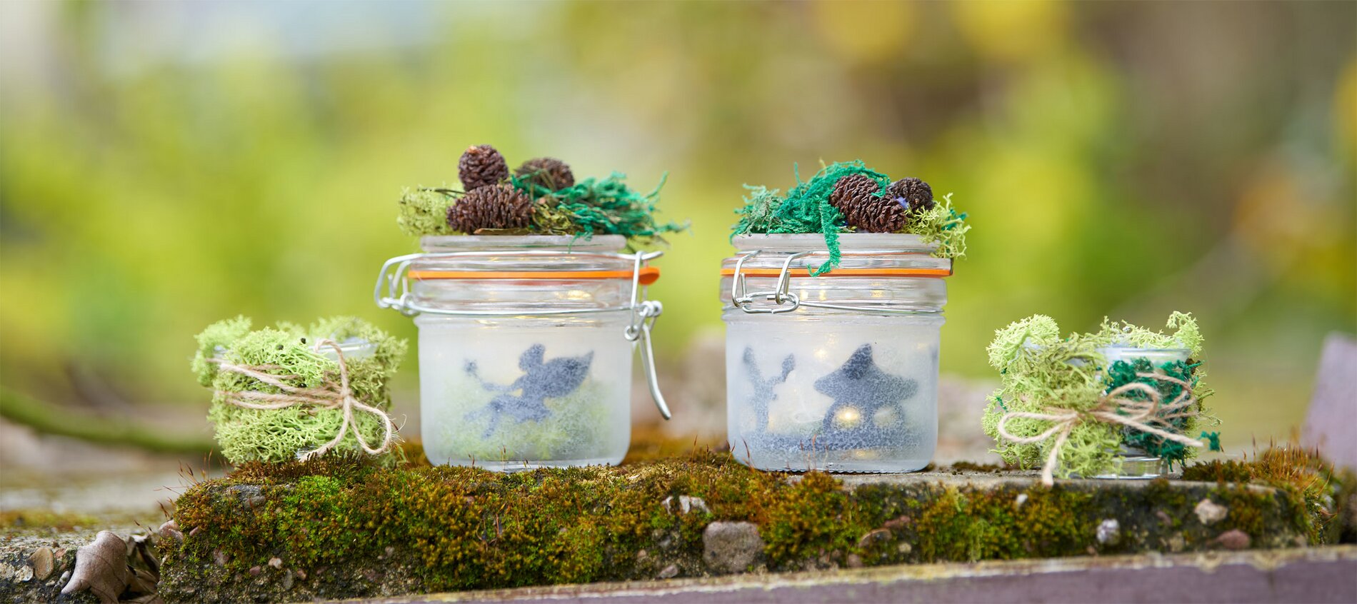 Udekoruj pokrywki i słoiki na tealighty mchem, mini szyszkami i sznurkiem według własnego gustu. Na koniec dodaj lampki do małych słoików na tealighty.