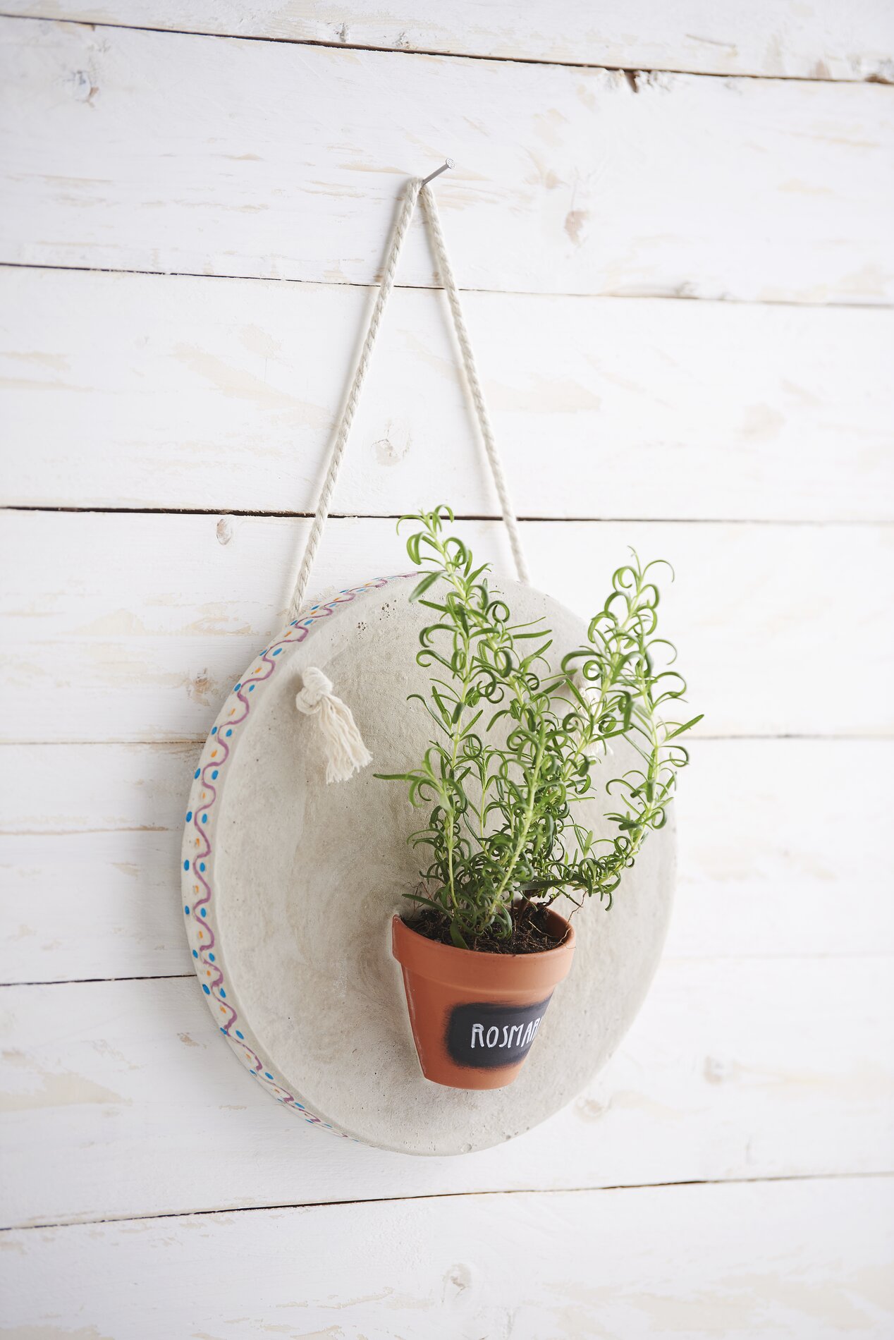 Teraz ostrożnie wywierć dwa otwory w płytce za pomocą wiertła do betonu. Następnie przeciągnij bawełniany sznurek przez te dwa otwory i zawiąż węzeł na każdym końcu. Aby móc później oznaczyć gliniane naczynie, wystarczy nałożyć farbę tablicową. Jak tylko farba wyschnie, możesz pisać po powierzchni tablicy kredą. Chcesz zmienić napis? Nie ma problemu - wystarczy zetrzeć stary napis mokrą szmatką, a powierzchnia tablicy może być ponownie oznakowana. Na koniec doniczkę z terakoty można zasadzić i powiesić w ogrodzie.
