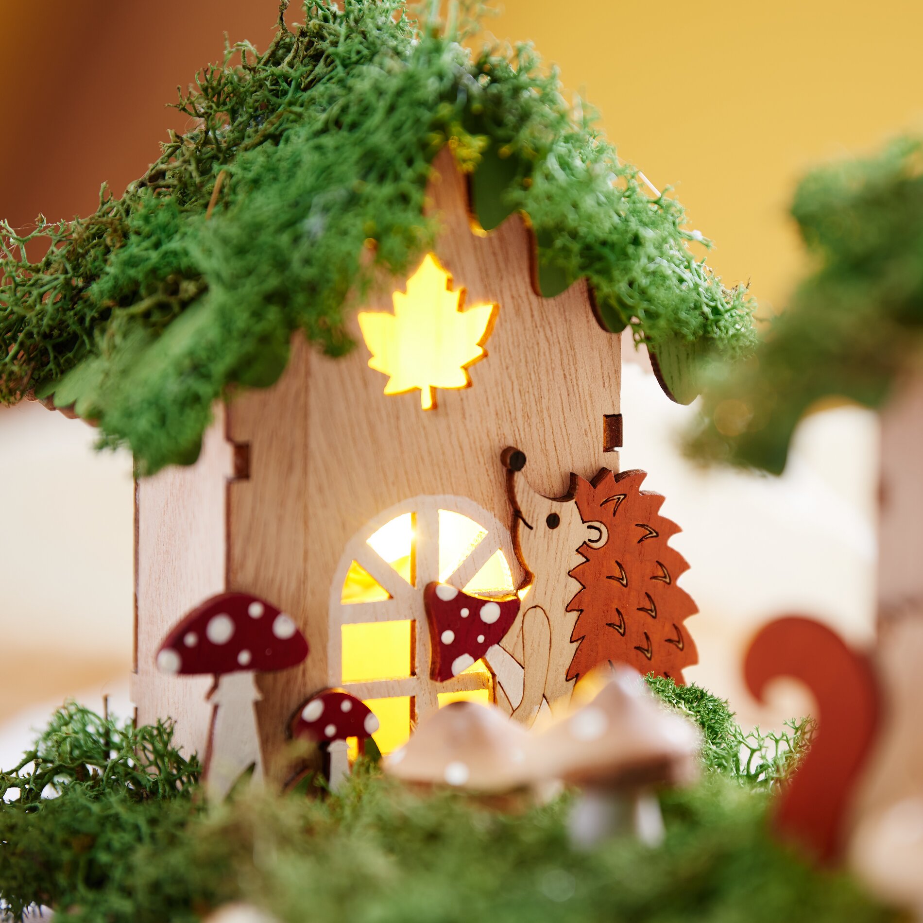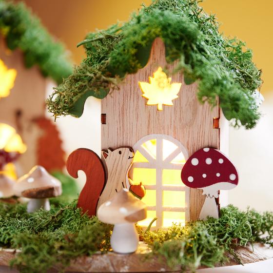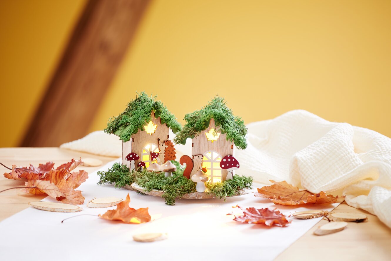 Teraz możesz udekorować jesienną aranżację. Przyklej mech i grzyby wokół domków. Stworzy to idylliczny jesienny krajobraz. Rozmieść dekoracje tak, aby tworzyły zrównoważony ogólny obraz, a wszystkie elementy były jak najlepiej wyeksponowane.