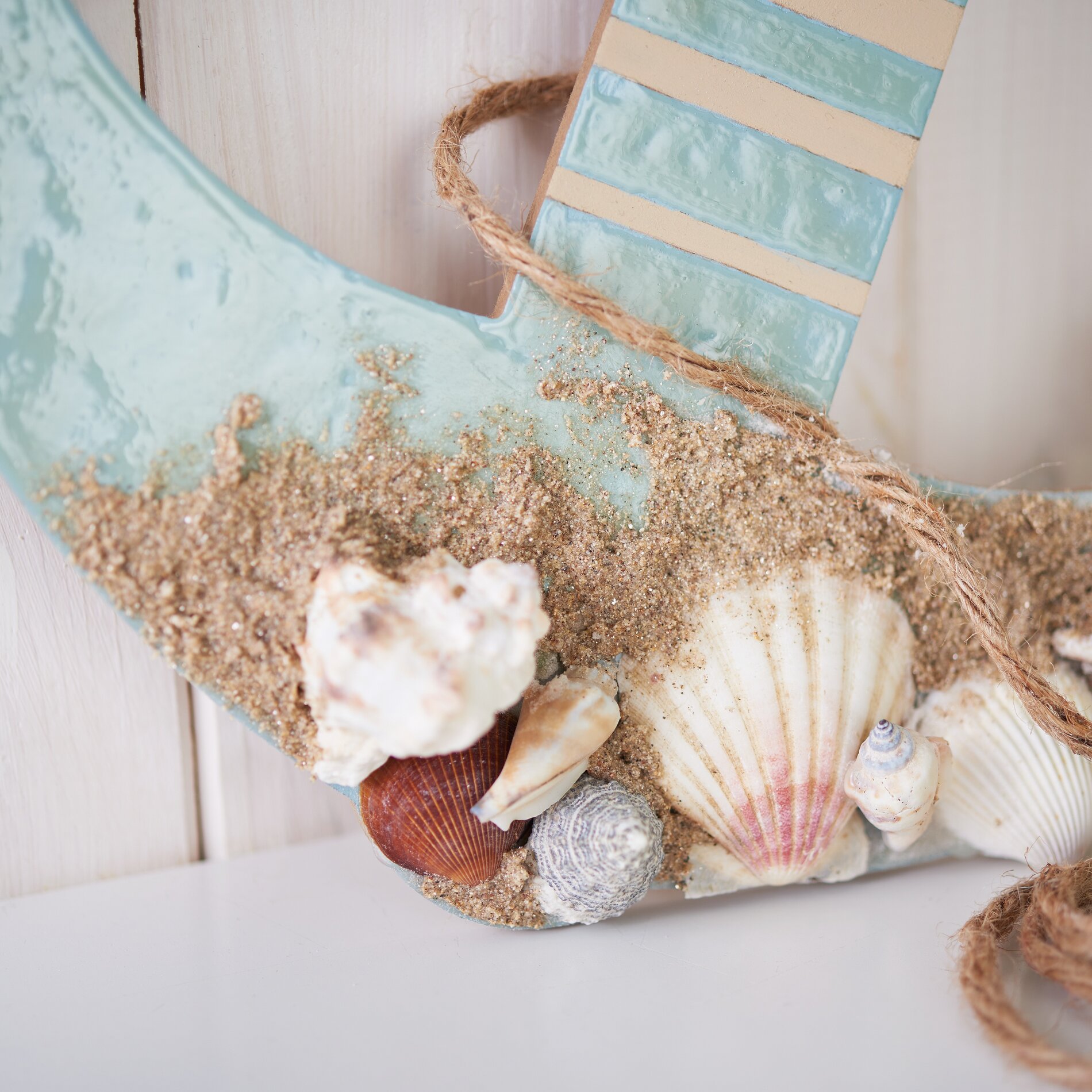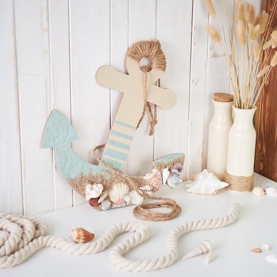 Podstawą tego pomysłu na dekorację jest drewniana kotwica VBS. Zacznij od zagruntowania całego kawałka drewna beżową farbą. Następnie pokoloruj dolną część drewnianej kotwicy kolorowymi paskami w kolorze morskiej zieleni lub podobnym: Użyj linijki i ołówka, aby narysować cienkie linie na obrabianym przedmiocie, które precyzyjnie określą poszczególne kolorowe obszary i ułatwią malowanie kolorem morskim. Upewnij się, że krawędzie kolorów są tak precyzyjne, jak to tylko możliwe.