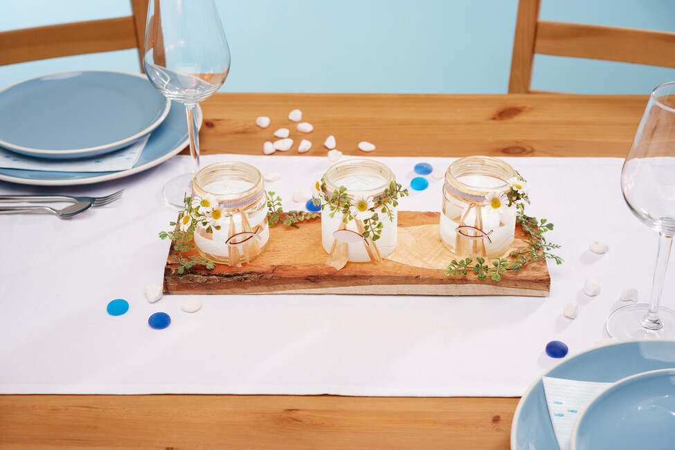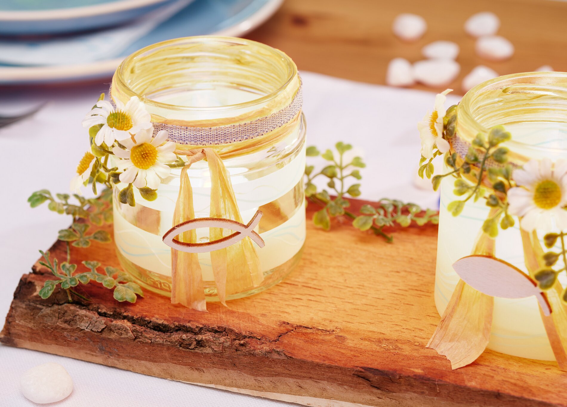 Teraz użyj różnych materiałów, aby spersonalizować małe słoiki i dębową deskę. Twoja wyobraźnia nie ma granic. Małe kwiaty, małe liście, rozrzucone kawałki z symbolem ryby i ozdobne wstążki to idealne dodatki do dekoracji.