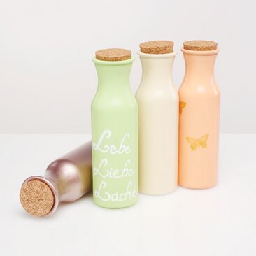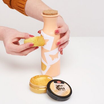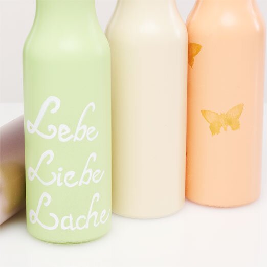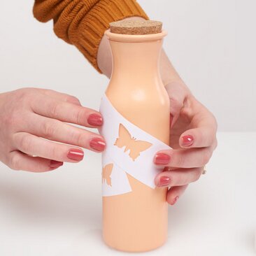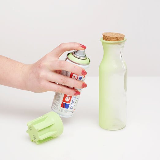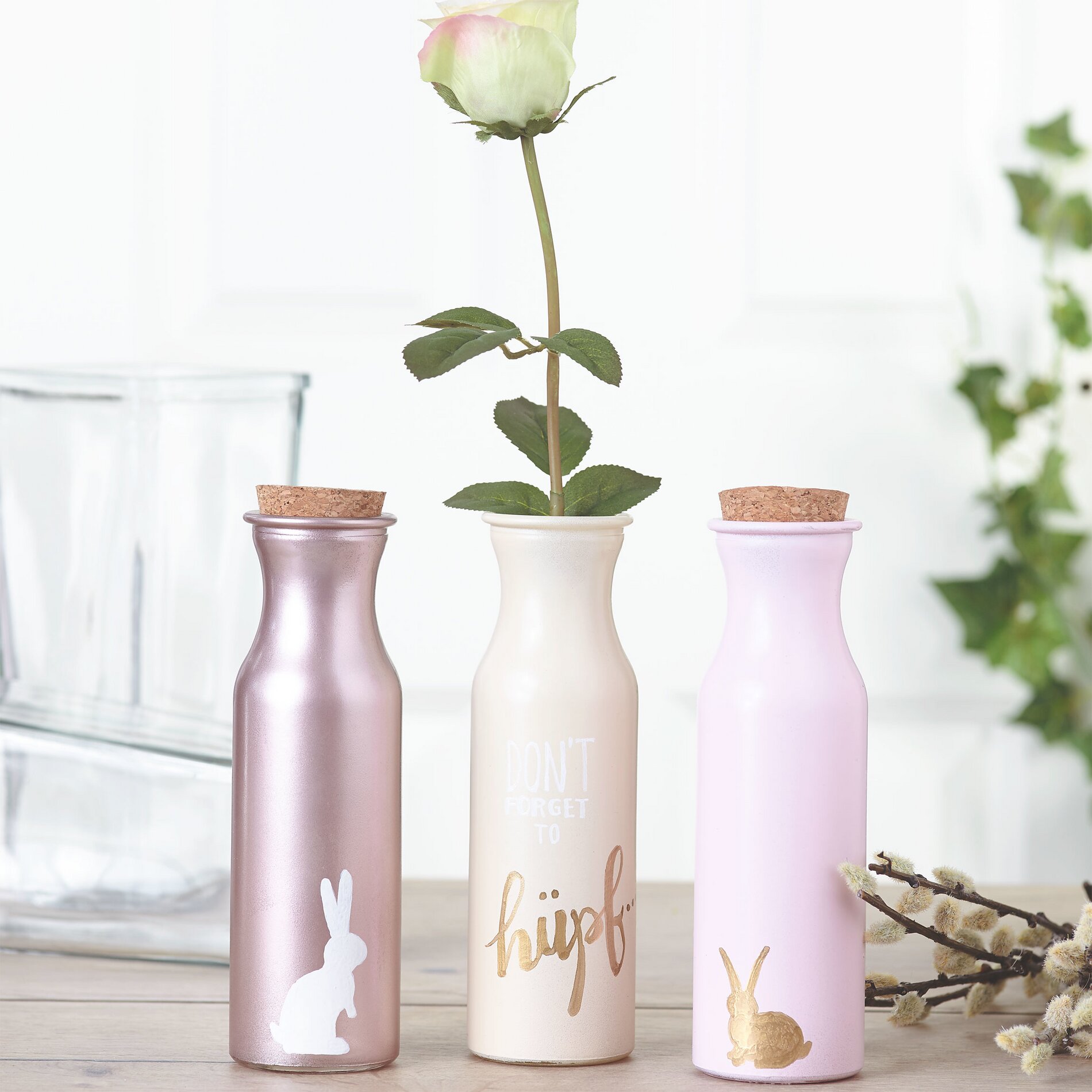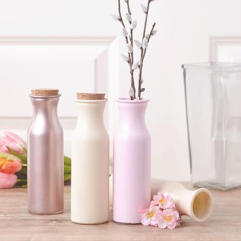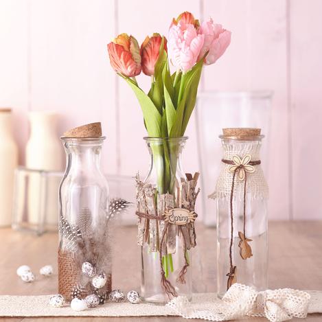 Wystarczy odrobina czasu i materiałów, aby ułożyć na szklanych butelkach jutową wstążkę, wiązki kory, małe piórka, kawałki drewna i ozdobne jajka. Przeciągnij pasek przezroczystej dwustronnej taśmy klejącej wokół szklanej butelki, aby ją zabezpieczyć. Wstążkę jutową można umieścić na wierzchu.