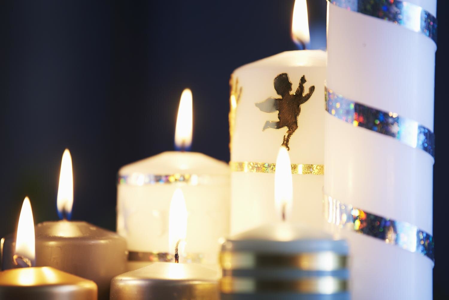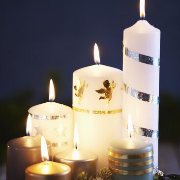 dekoracyjnych arkuszy wosku za pomocą dziurkacza do motywów, a następnie umieścić na świecach. Wystarczy tylko ręcznie podgrzać te woskowe motywy, aby przykleiły się do świec.