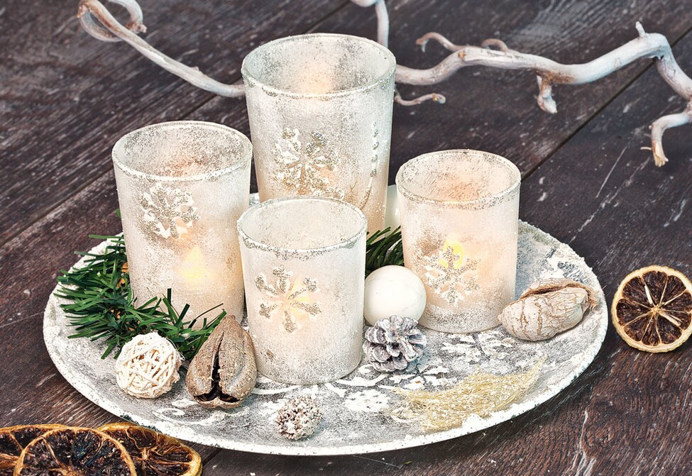 Ta aranżacja będzie Ci towarzyszyć przez cały sezon zimowy. Dzięki małym, mroźnym elementom i dekoracyjnemu śniegowi, prosty szklany talerz i cztery kieliszki do podgrzewaczy przekształcają się w harmonijną dekorację. Oświetlona świeczkami, świeci ciepłym światłem i sprawia, że zimna pora roku wydaje się nieco jaśniejsza.