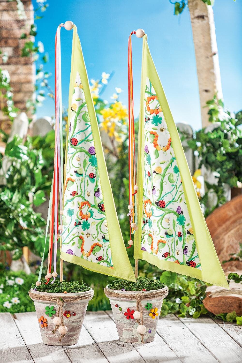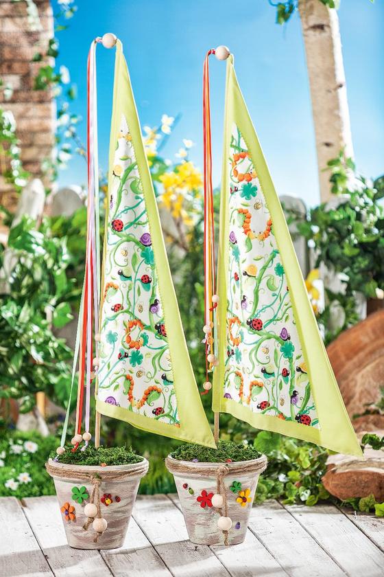 Wypełnij doniczkę miękką gliną (alternatywnie obciąż doniczkę kamieniami), aby później dekoracja była wystarczająco stabilna . Weź drewniany patyk o długości ok. 60 cm, wyciągnij flagę , a następnie wbij patyk w jeszcze wilgotną miękką glinę.