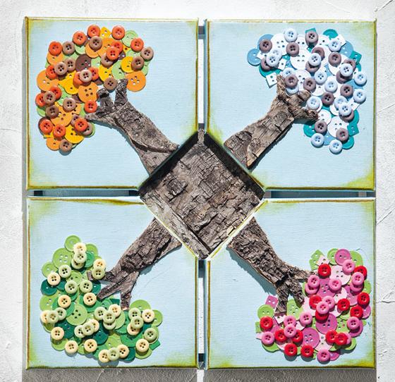 Użyj dziurkacza do guzików, aby wyciąć guziki z papieru budowlanego w kolorach pasujących do pór roku i przyklej je na zakładkę w kształcie korony drzewa.