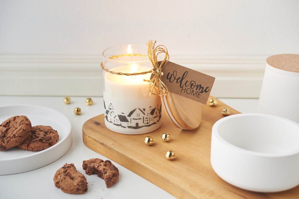 8. Przymocuj motywOwiń kalkę z motywem dekorowanego domu wokół spodu świecy i ostrożnie przyklej ją z tyłu.
