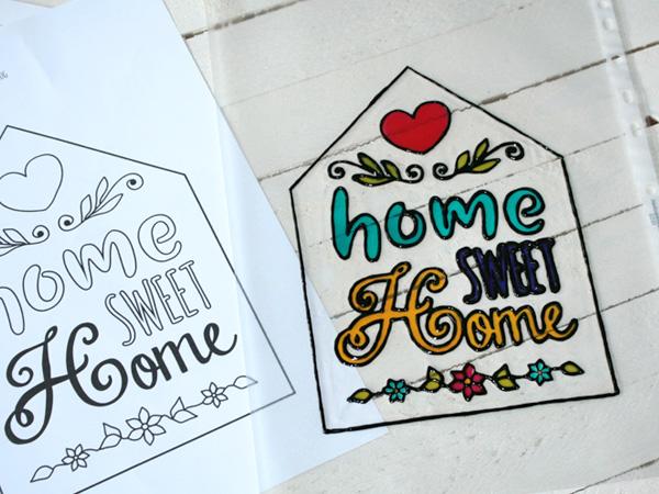 Zacznij od obrysowania konturów szablonu. Przytrzymaj końcówkę butelki około pół centymetra nad powierzchnią, aby stworzyć cienkie, równe linie. W przypadku zakrzywionych słów, takich jak "Home" i "Sweet", narysuj kontury nieco poza czcionką, aby pozostawić wystarczająco dużo miejsca między literami.