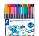 Podwójne pisaki fibrowe STAEDTLER z końcówką pędzelkową nadają się do ilustracji, szczegółowych rysunków, mangi i kolorowania. 36 jasnych kolorów jest rozpuszczalnych w wodzie, dzięki czemu można uzyskać wspaniałe efekty akwareli. Najlepiej nadaje się do tego szczególnie gładki papier akwarelowy. Dwuwłóknowa końcówka do malowania ma 2 różne koronka. Szerokość linii cienkiej koronki wynosi od 0,5 do 0,8 mm, a szersza koronka ma szerokość linii od 1,0 do 6,0 mm.