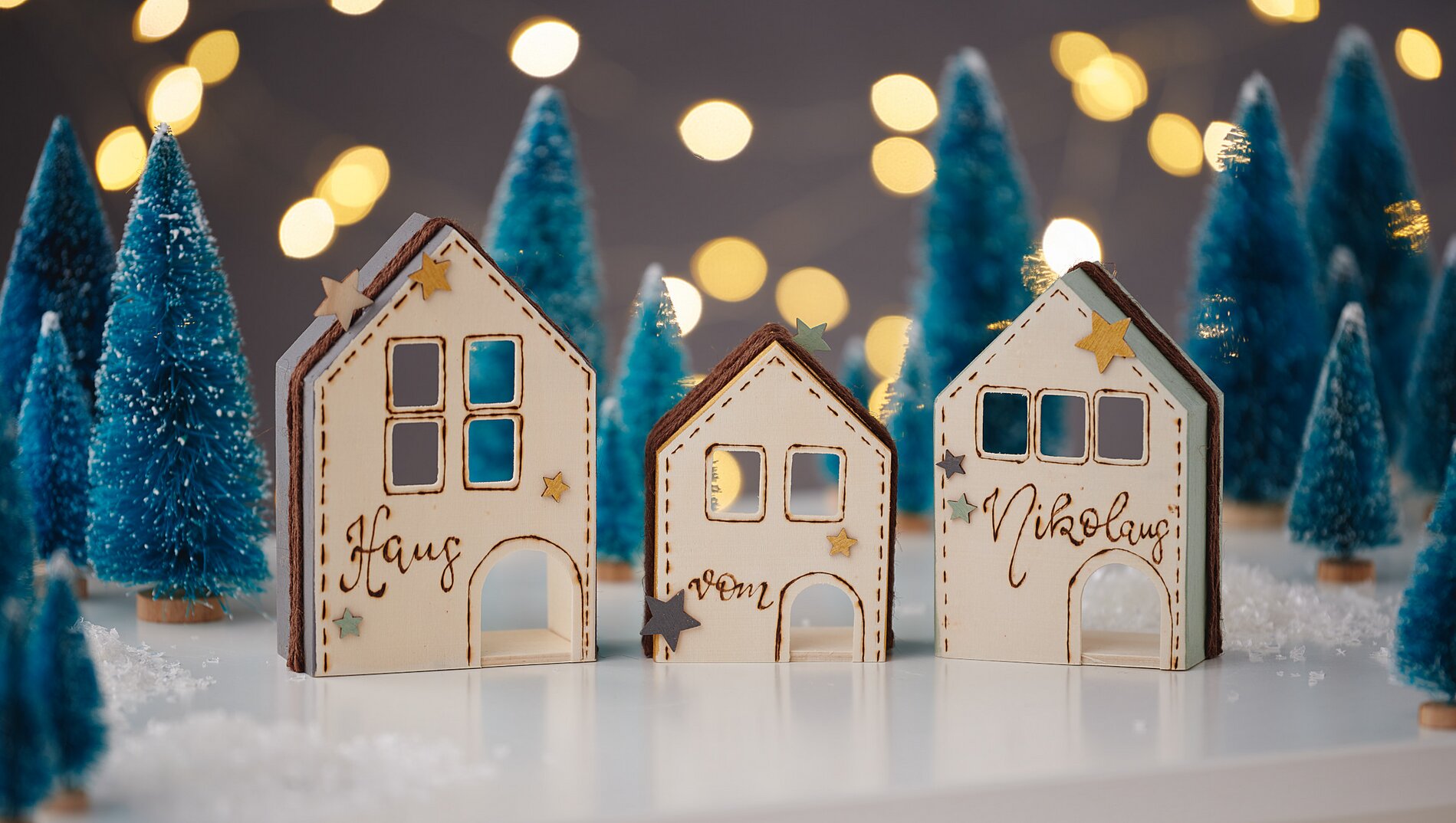 Teraz wystarczy przymocować kilka rozrzuconych elementów do domków za pomocą kleju rzemieślniczego i domki są gotowe.