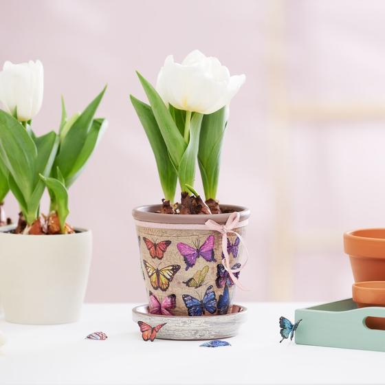 Teraz użyj kleju rzemieślniczego VBS, aby przymocować motyle do doniczki z terakoty.