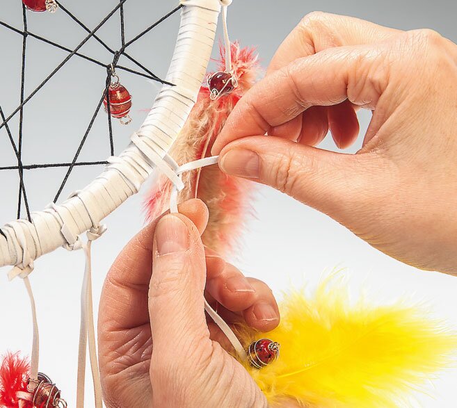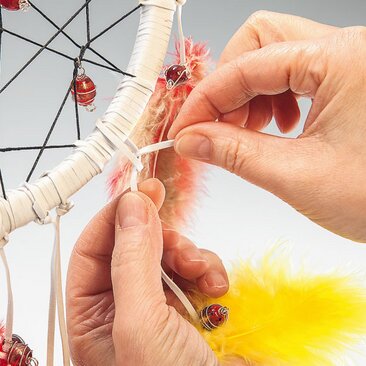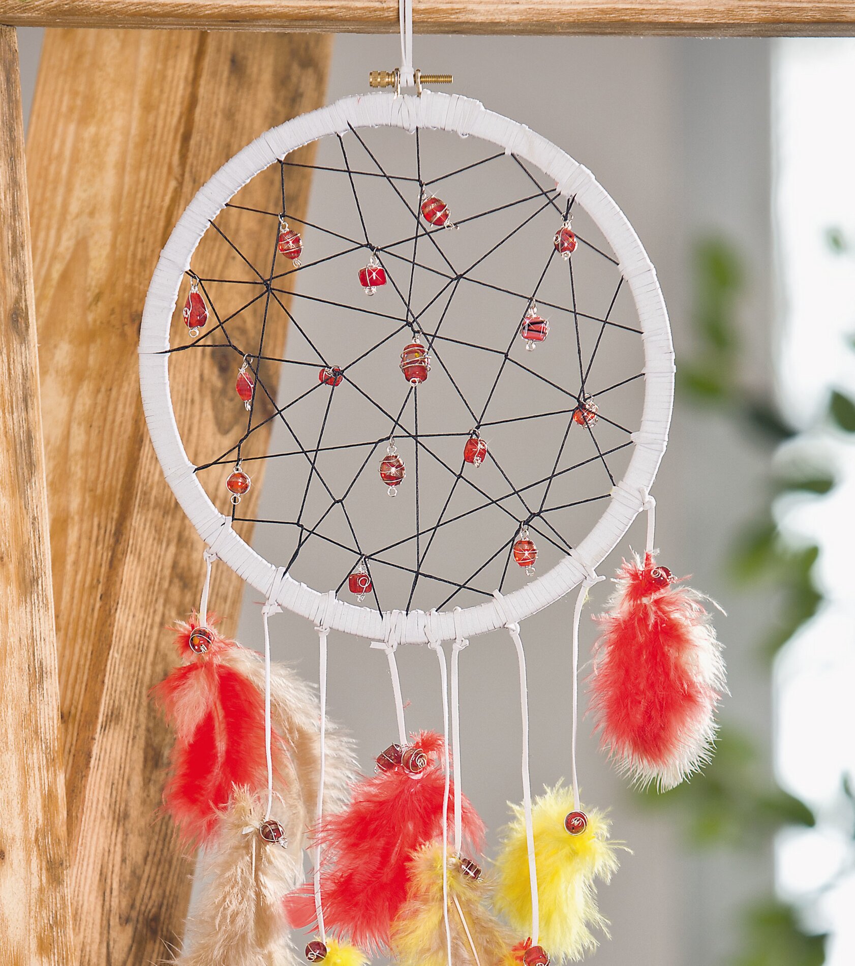 łapacza snów. Owinięty w biel i ozdobiony piórami i szklanymi koralikami w jasnych kolorach, z pewnością zapewni relaksujący sen i słodkie sny.