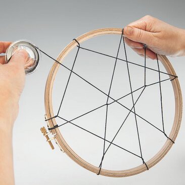 Zawiąż ciasno sznurek jubilerski na kółku do haftowania i rozciągnij go na przeciwną stronę. Owiń sznurek raz wokół pierścienia.