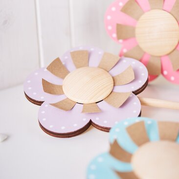 Weź trzy wycięte kwiaty z papieru kraft i przyklej drewnianą płytkę na środku każdego z nich.